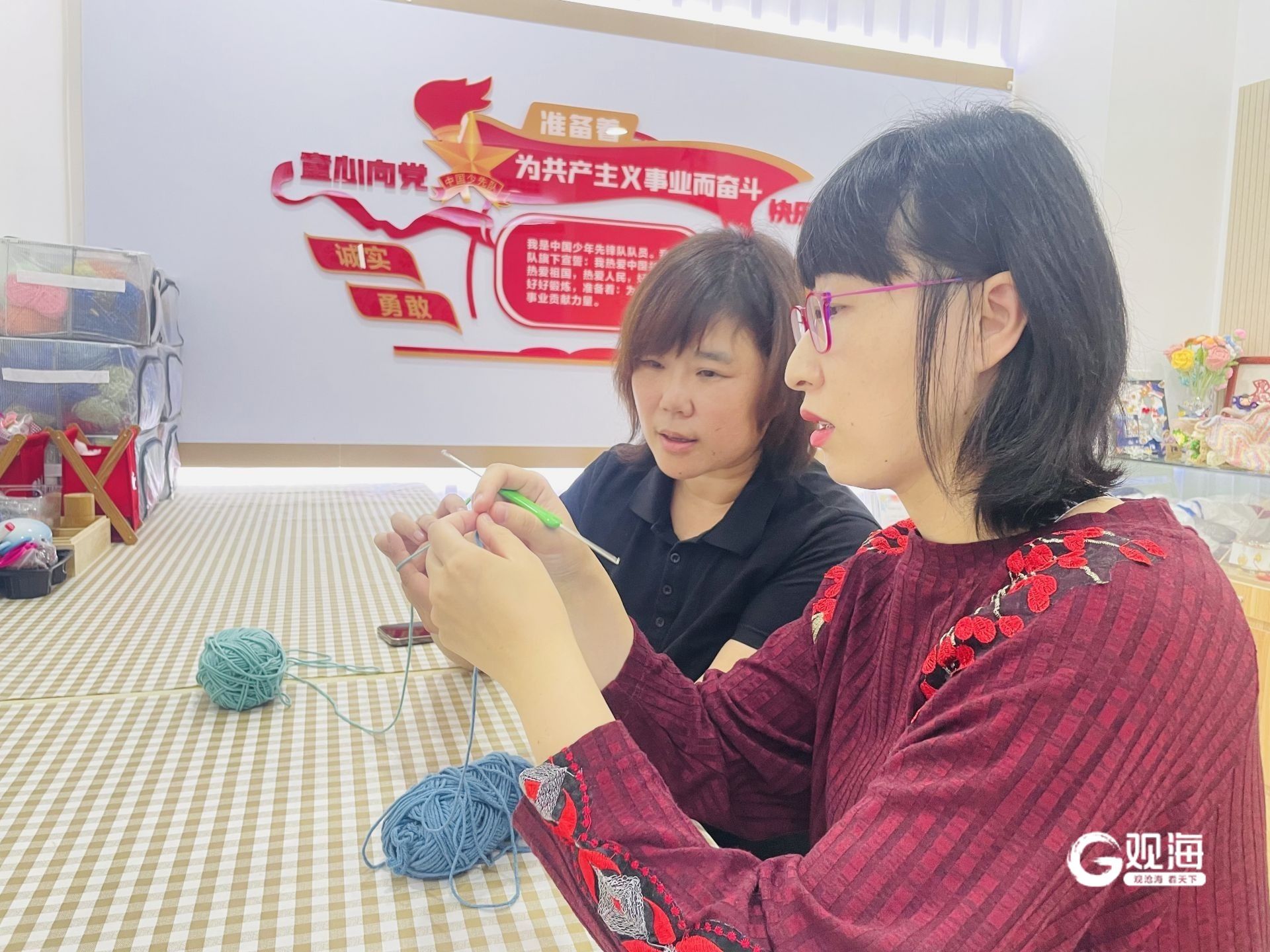 每周三下午,石岭路社区的非遗手工创益工坊都会开办编织课,教室里坐满了前来学习编织技能的宝妈们。石岭路社区党委副书记仇哲艳是工坊最早的老师,她曾经也是一位待业的二孩宝妈。“编织技艺是我在家带娃时自学的,最初是给孩子织毛衣、帽子、围巾,后来织得越来越多、越来越好。我到社区工作后,就想着可以带领有时间、感兴趣的姐妹们一起学,于是就成立了这个非遗手工创益工坊。”仇哲艳告诉记者。